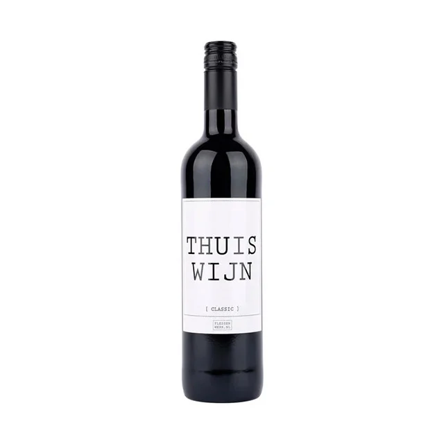 Een super leuke fles witte of rode wijn met wit etiket en tekst 'Thuiswijn'. Het perfecte kado voor iedereen die graag z'n eigen huiswijn wilt!750 ml.