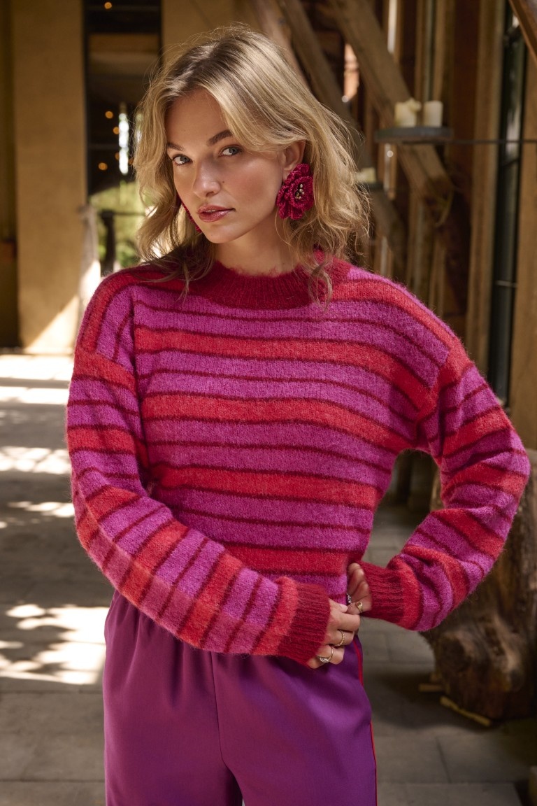 Voeg kleur toe aan je outfit met de Blouse Kess van Ydence! Deze fuchsia, paarse en rode blouse is comfortabel en veelzijdig, perfect voor elke gelegenheid.