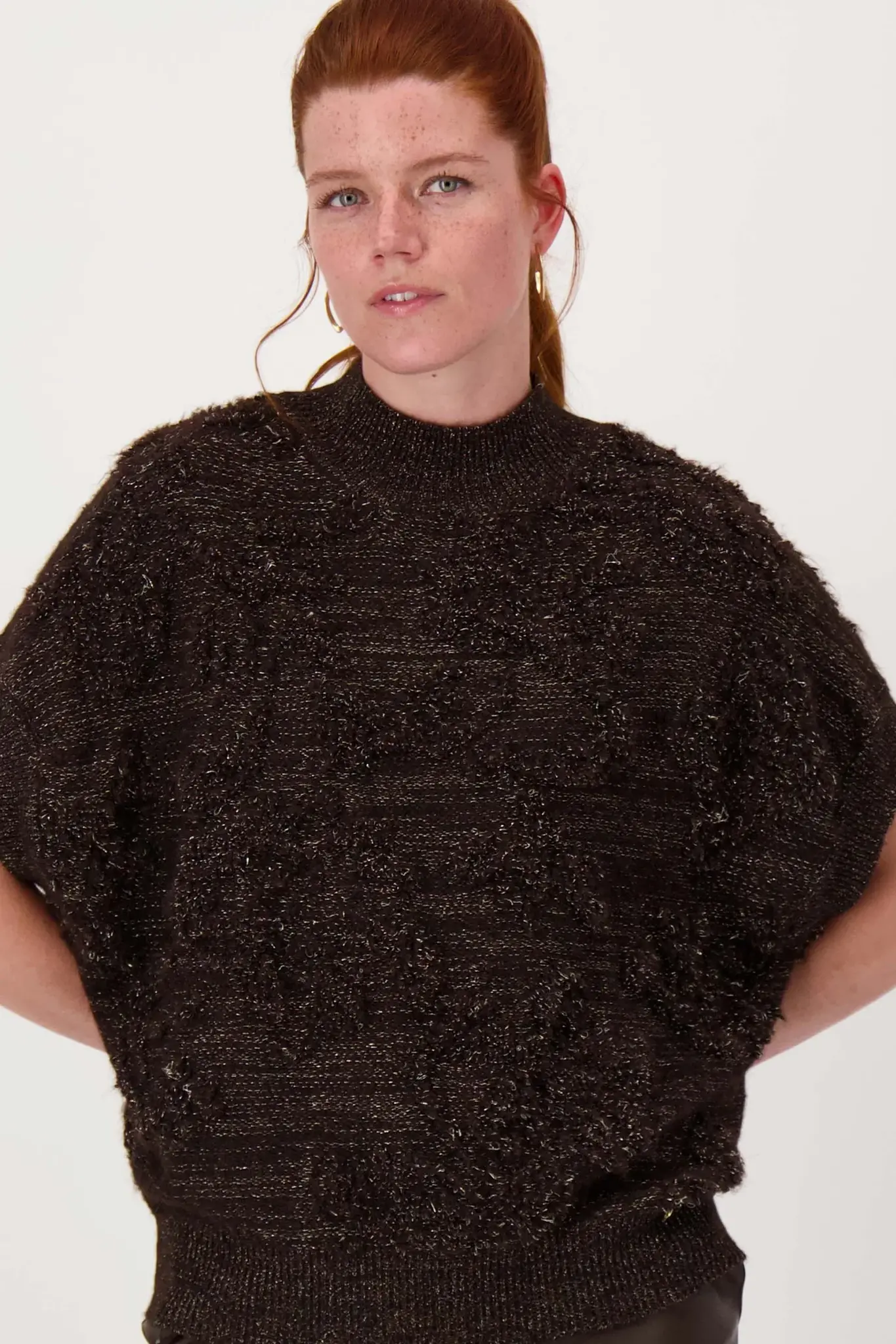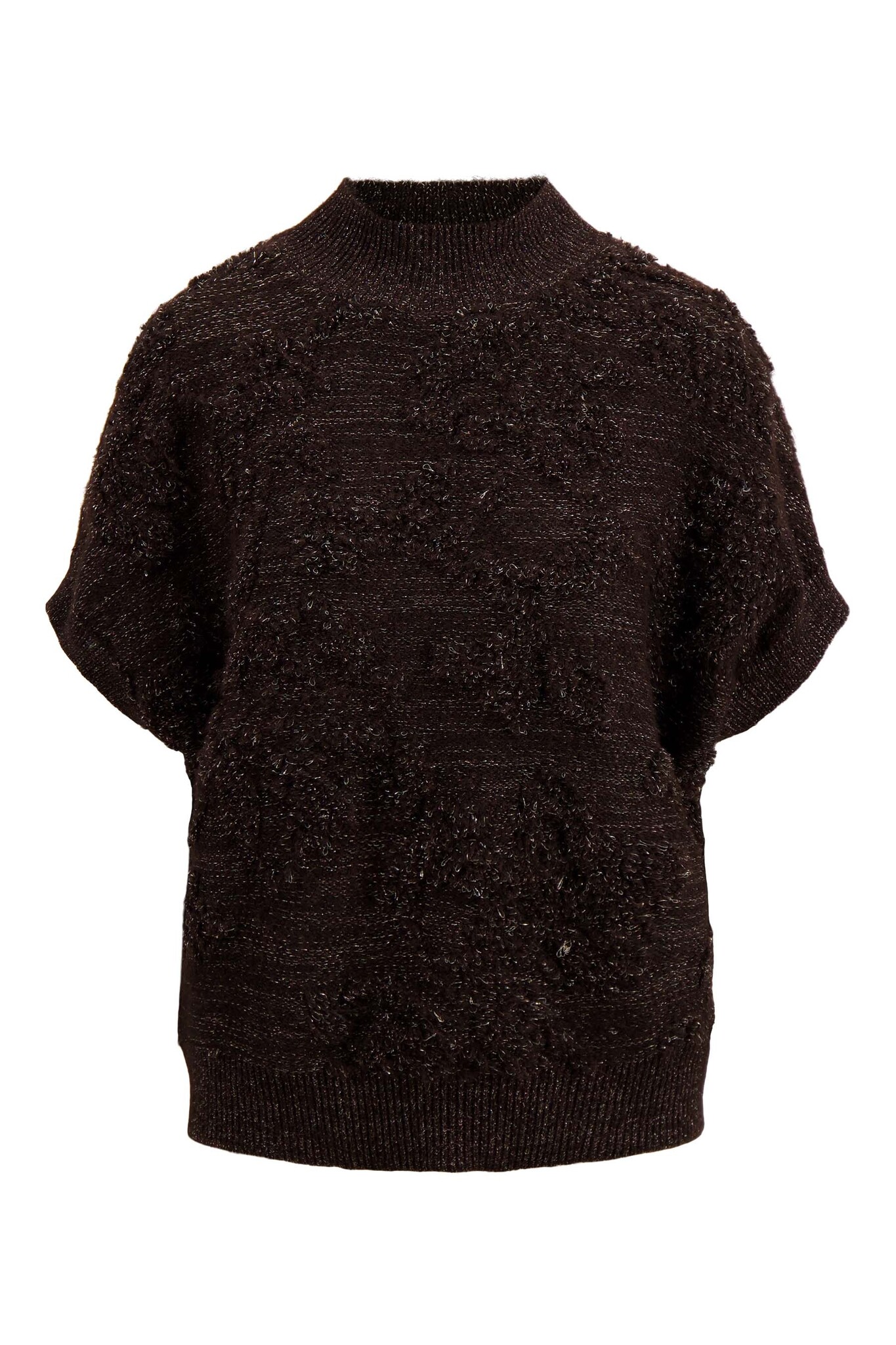 Deze Zusss mouwloze trui met lurex jacquard is een zachte must-have voor je garderobe. De chocoladebruine kleur met subtiele gouden glans geeft een feestelijke maar toch basic uitstraling. Deze trui valt op door zijn rijke, textuurrijke jacquard en relaxed model. Perfect voor wie een stoere, unieke trui zoekt binnen de categorie truien. Combineer ‘m met je favoriete basics voor een fijne, warme outfit die nét even anders is.